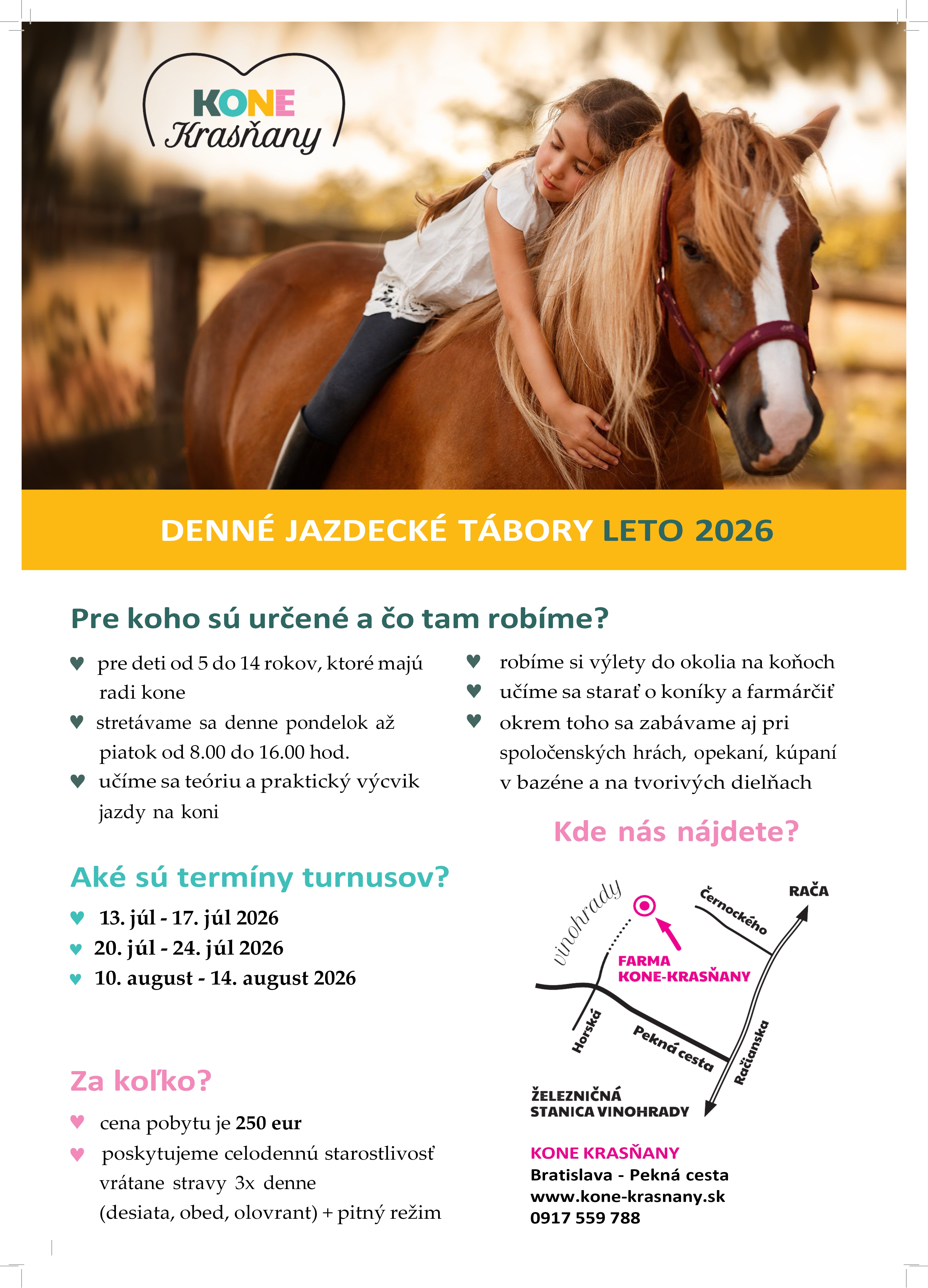 • v cene tábora je zahrnutá strava 3 x denne (desiata, obed, olovrant), pitný režim, jazda na koni, a veľa teórie o koníkoch